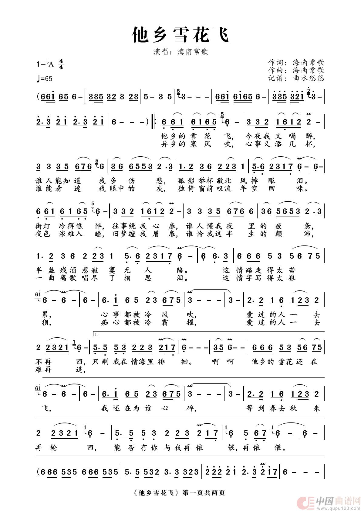 曲谱:他乡雪花飞