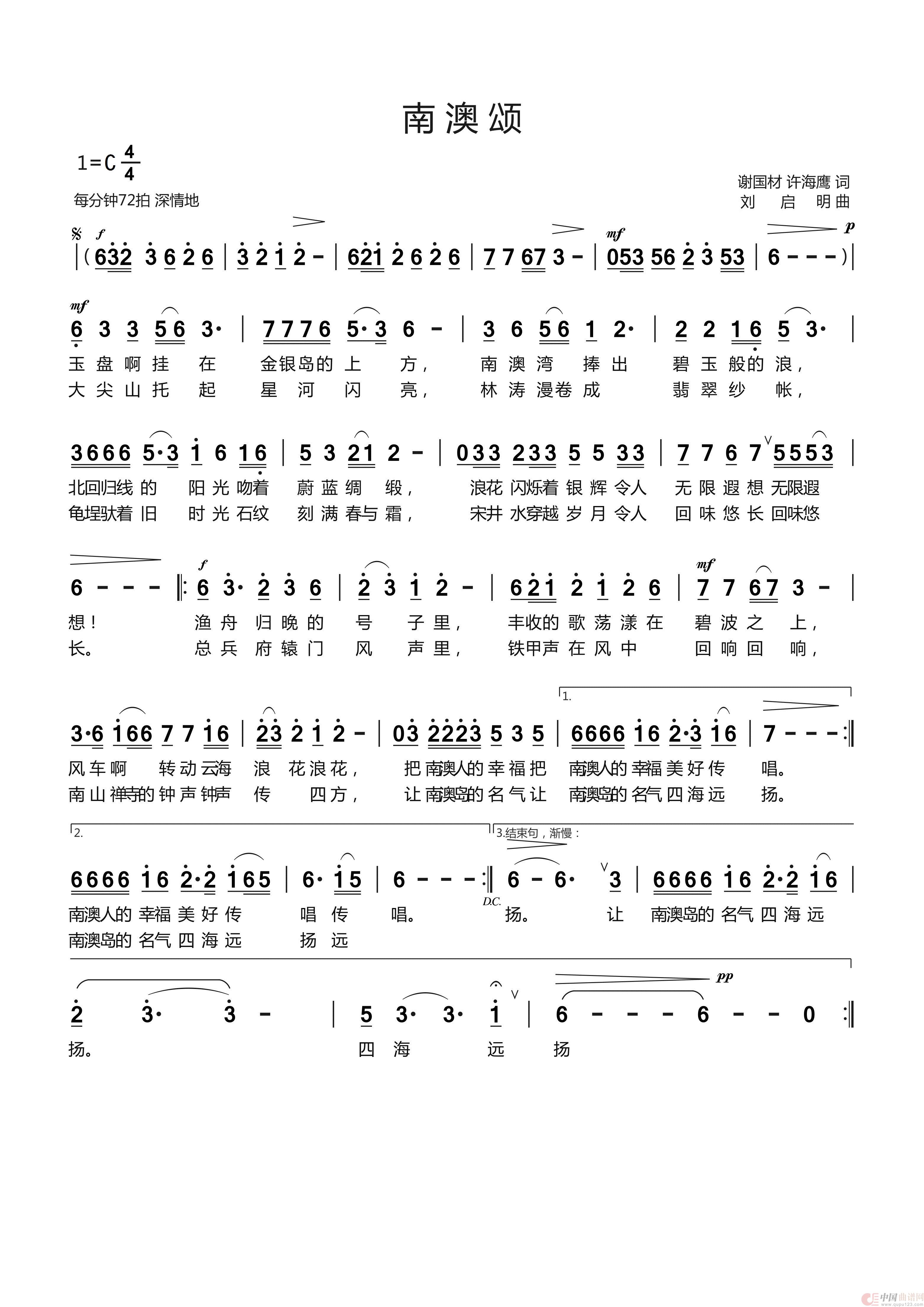 曲谱:南澳颂 谢国材 许海鹰词 刘启明曲 屈慧演唱
