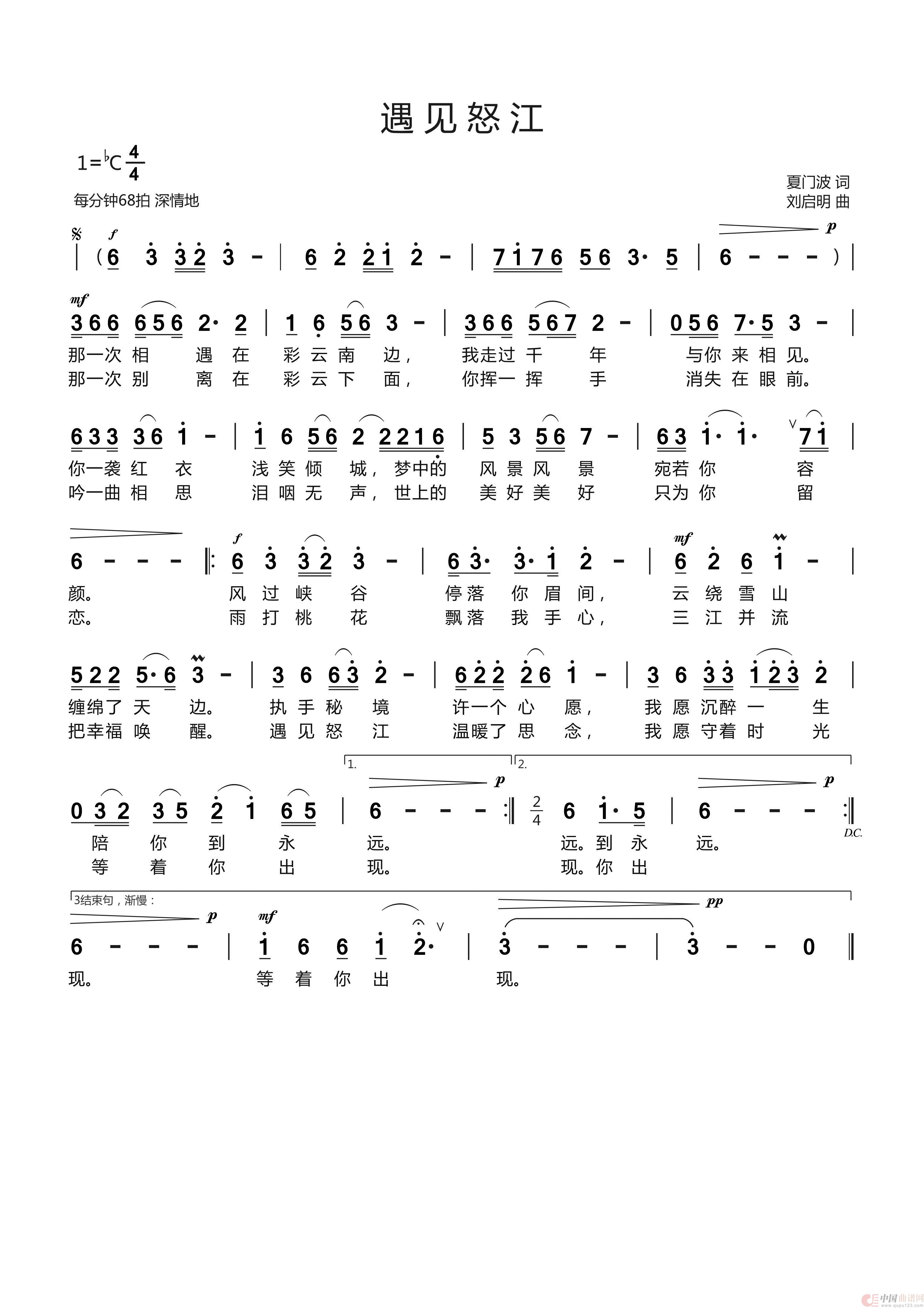 曲谱:遇见怒江 夏门波词 刘启明曲 崔叶华演唱