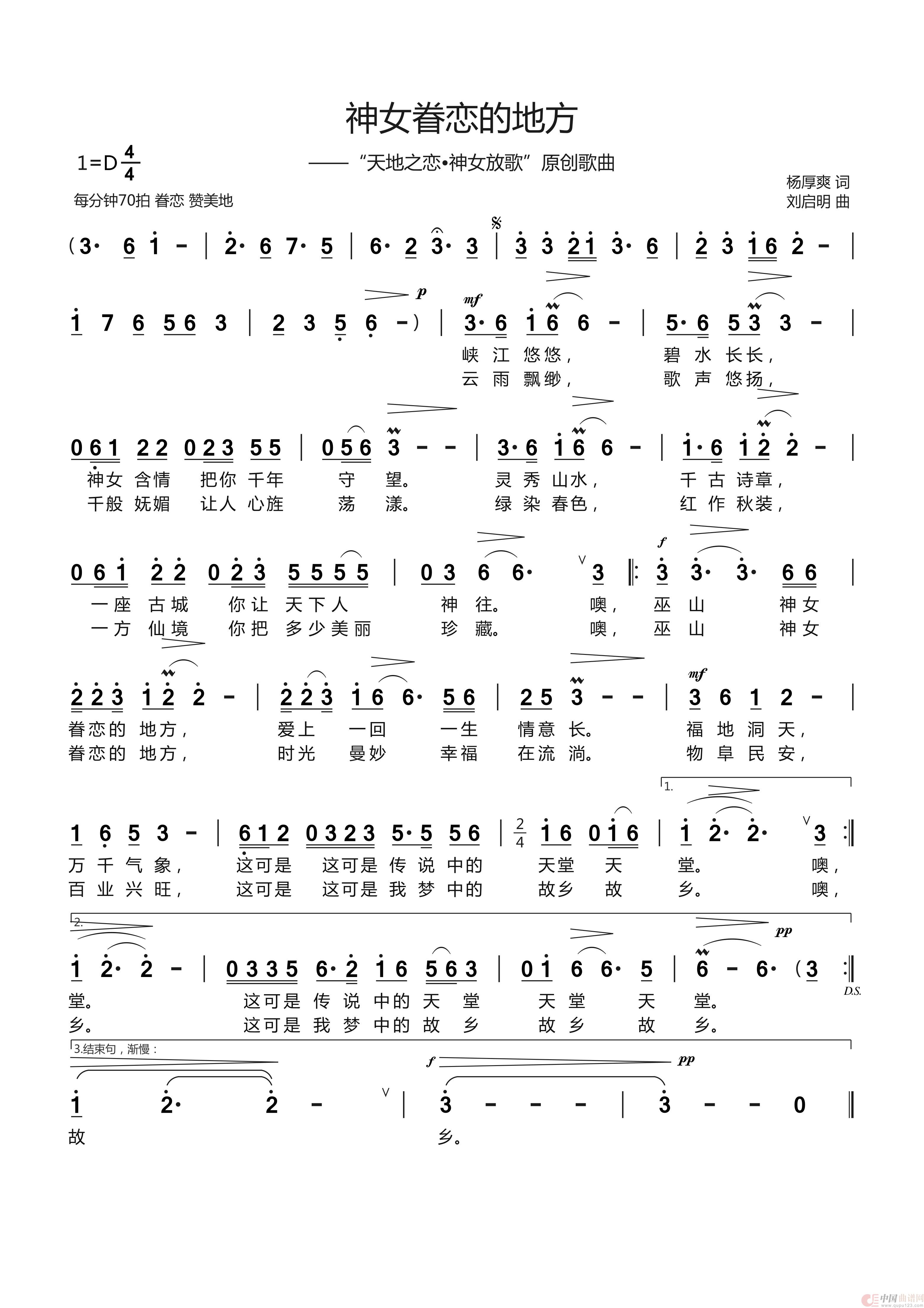 曲谱:《 神女眷恋的地方》杨厚爽词 刘启明曲 么健演唱