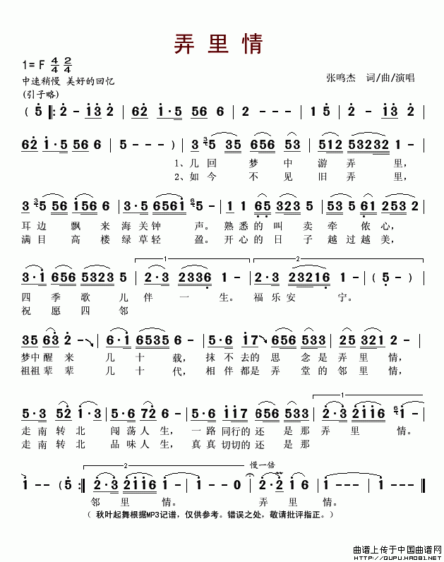 作词:张鸣杰 作曲:张鸣杰 演唱(奏):张鸣杰 格式:简谱 来源:秋叶起舞 记谱上传 上传:秋叶起舞