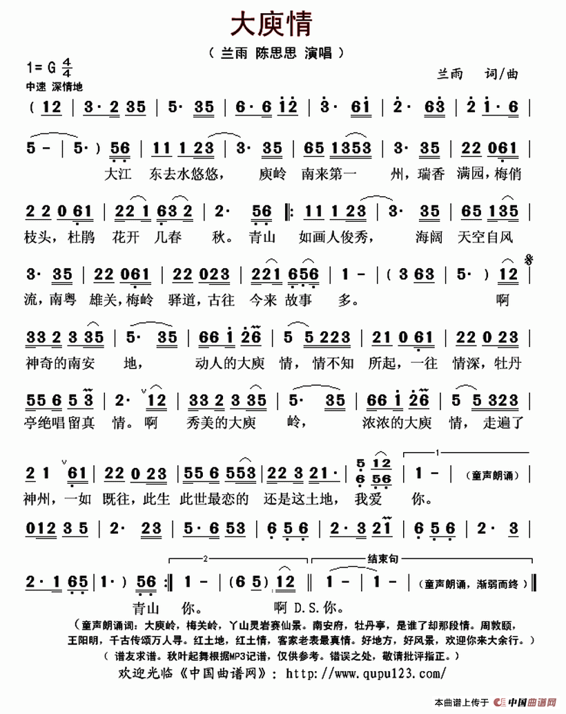 作词:兰雨 作曲:兰雨 演唱(奏):兰雨 陈思思 来源:秋叶起舞记谱上传 上传:秋叶起舞