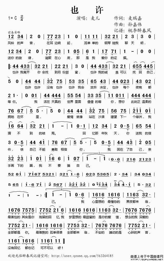 作词:麦瑞嘉 作曲:孙嘉伟 演唱(奏):麦儿 格式:简谱 来源:桃李醉春风记谱 上传:桃李醉春风
