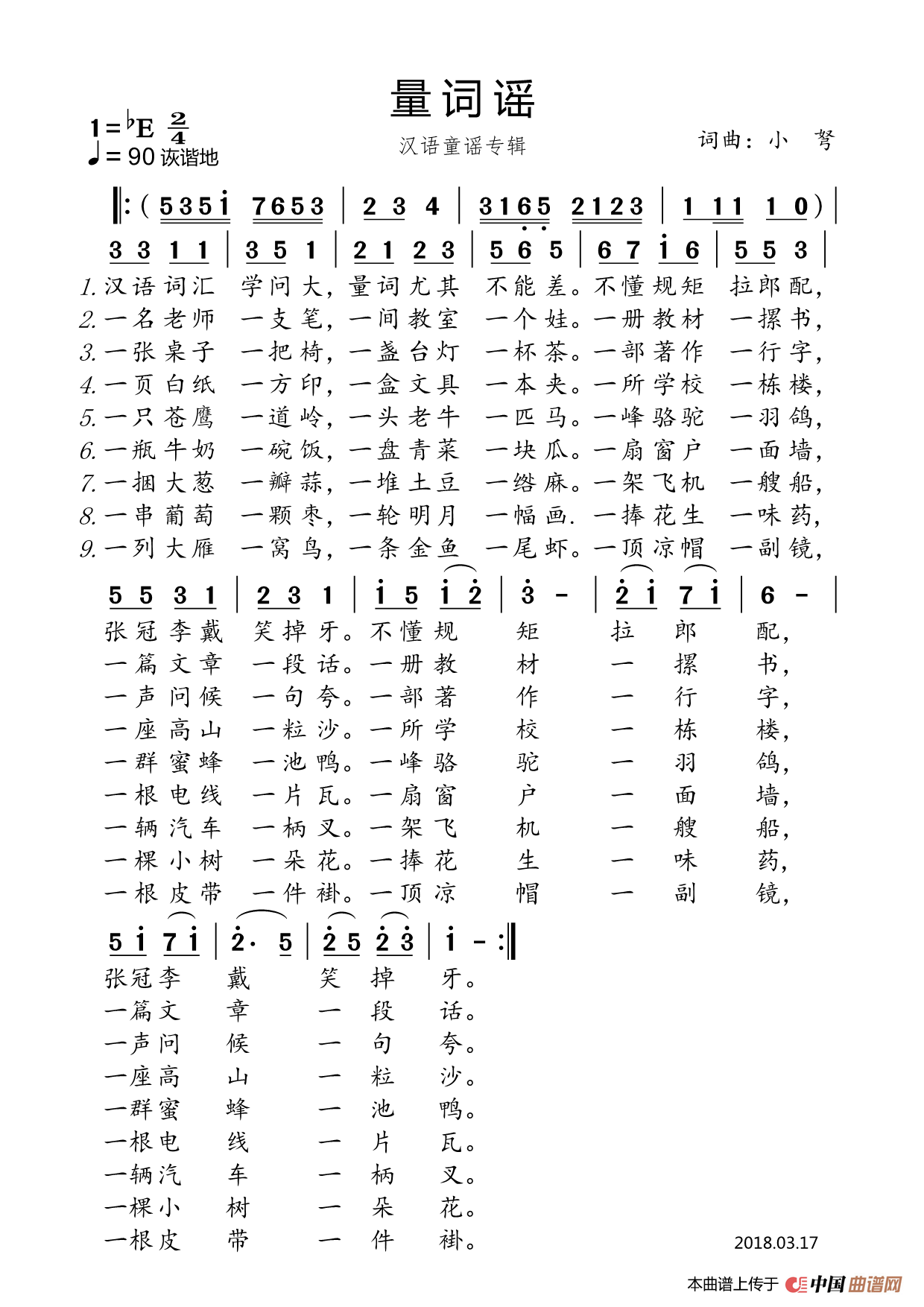 2018年7月创作了《量词歌》,一年多的时间,不少爱好者指出了该曲旋律和歌词的不足。因此重新谱了曲。最后确定了常用的64个量词,曲调也更趋合理。作为小学生学习和记忆量词还是有很大帮助的。旧版也保留在后面。