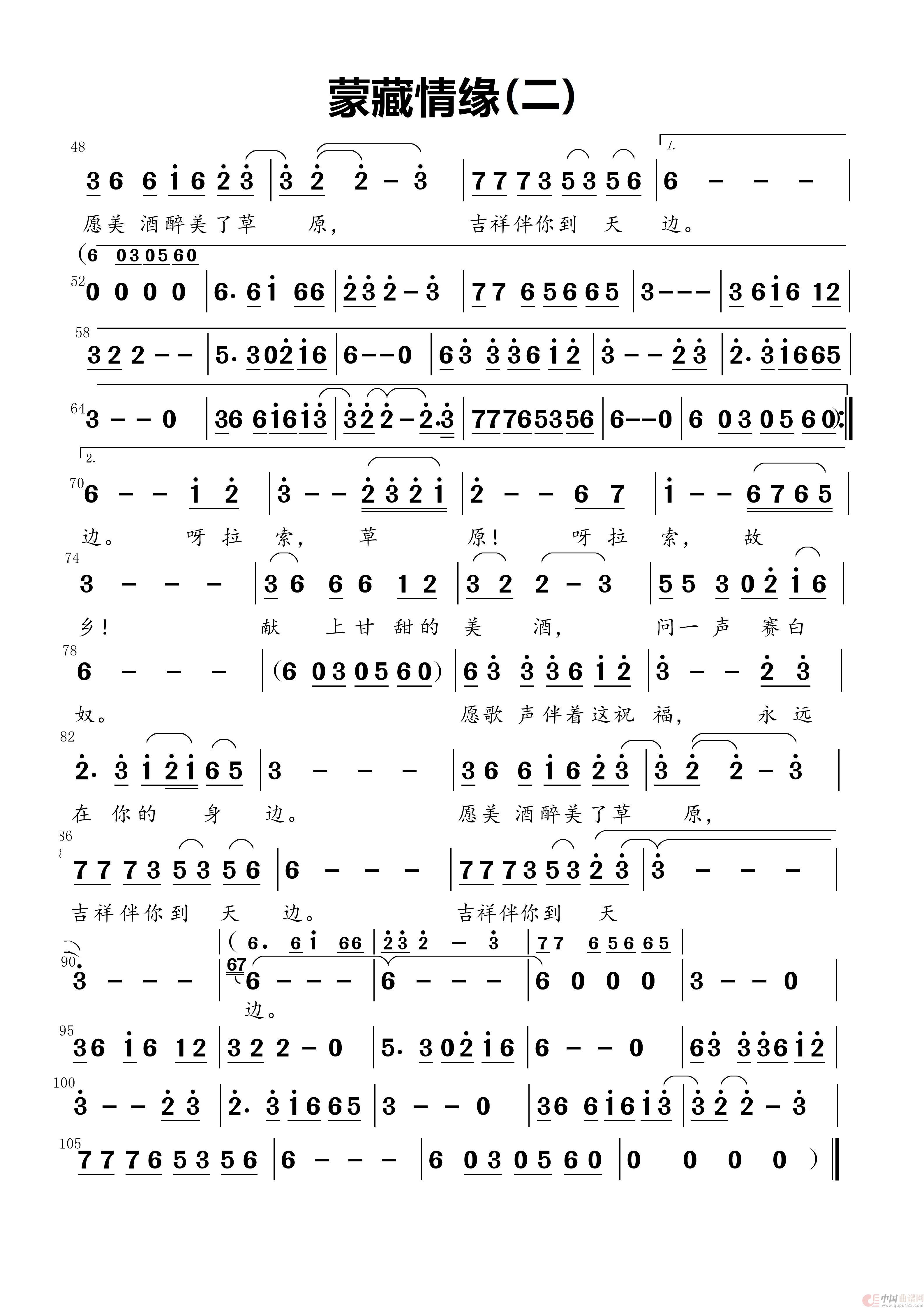 应乐友lintao9449在8月10日的要求,特对DJ版的《蒙藏情缘》记谱上传,希望喜欢,并批评指正!工作忙,近两个月没浏览过“中国曲谱网”,见谅!