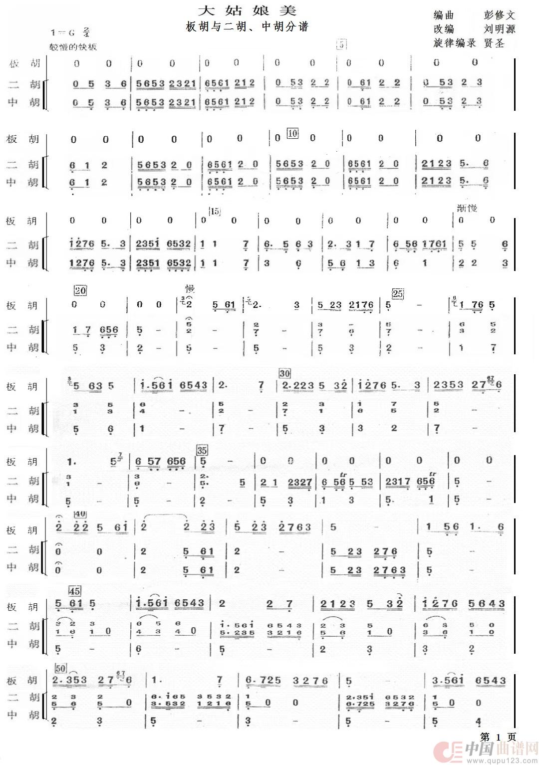 板胡与乐队 大姑娘美 板胡二胡中胡分谱