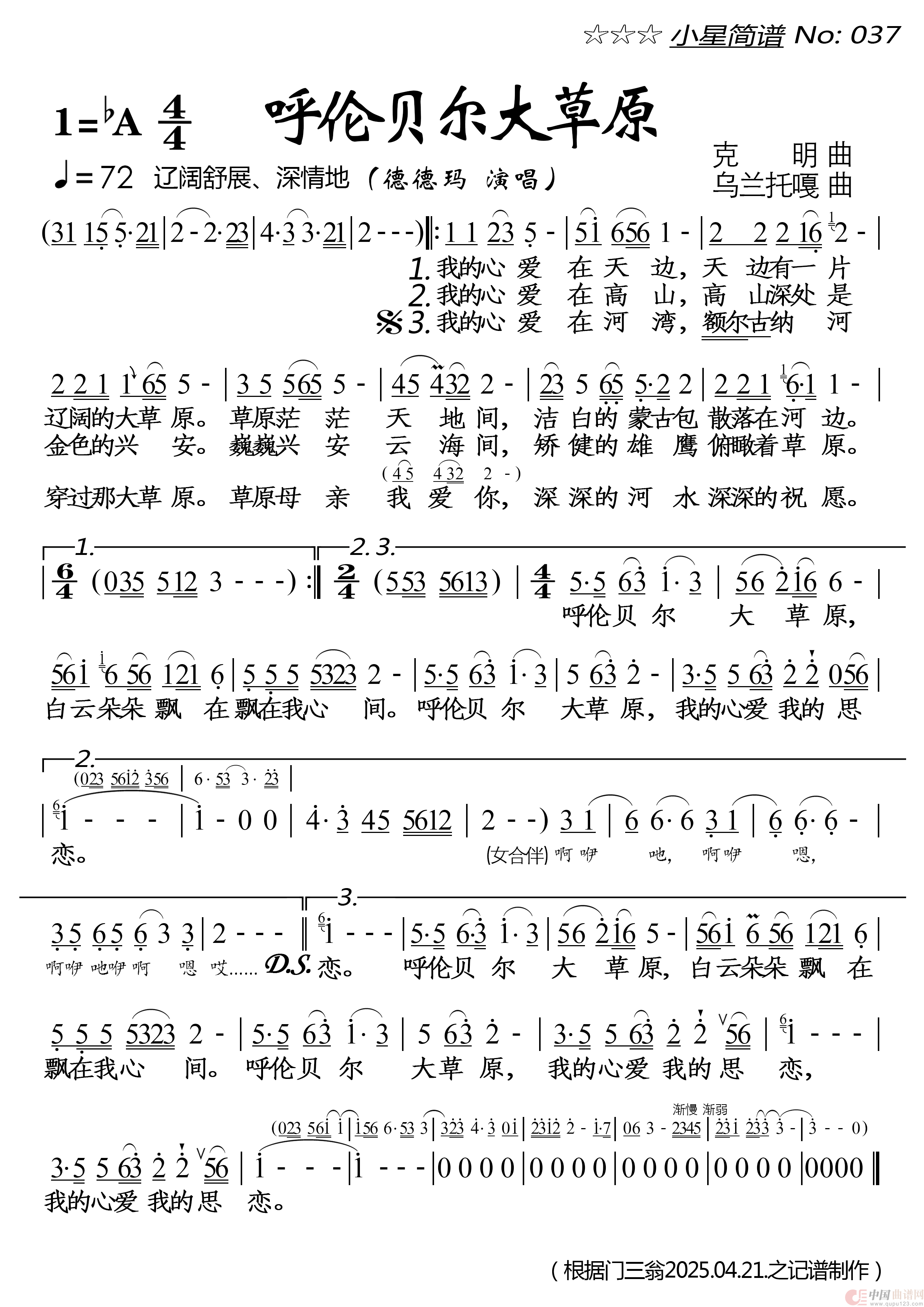 关于《呼伦贝尔大草原》曲谱的评论