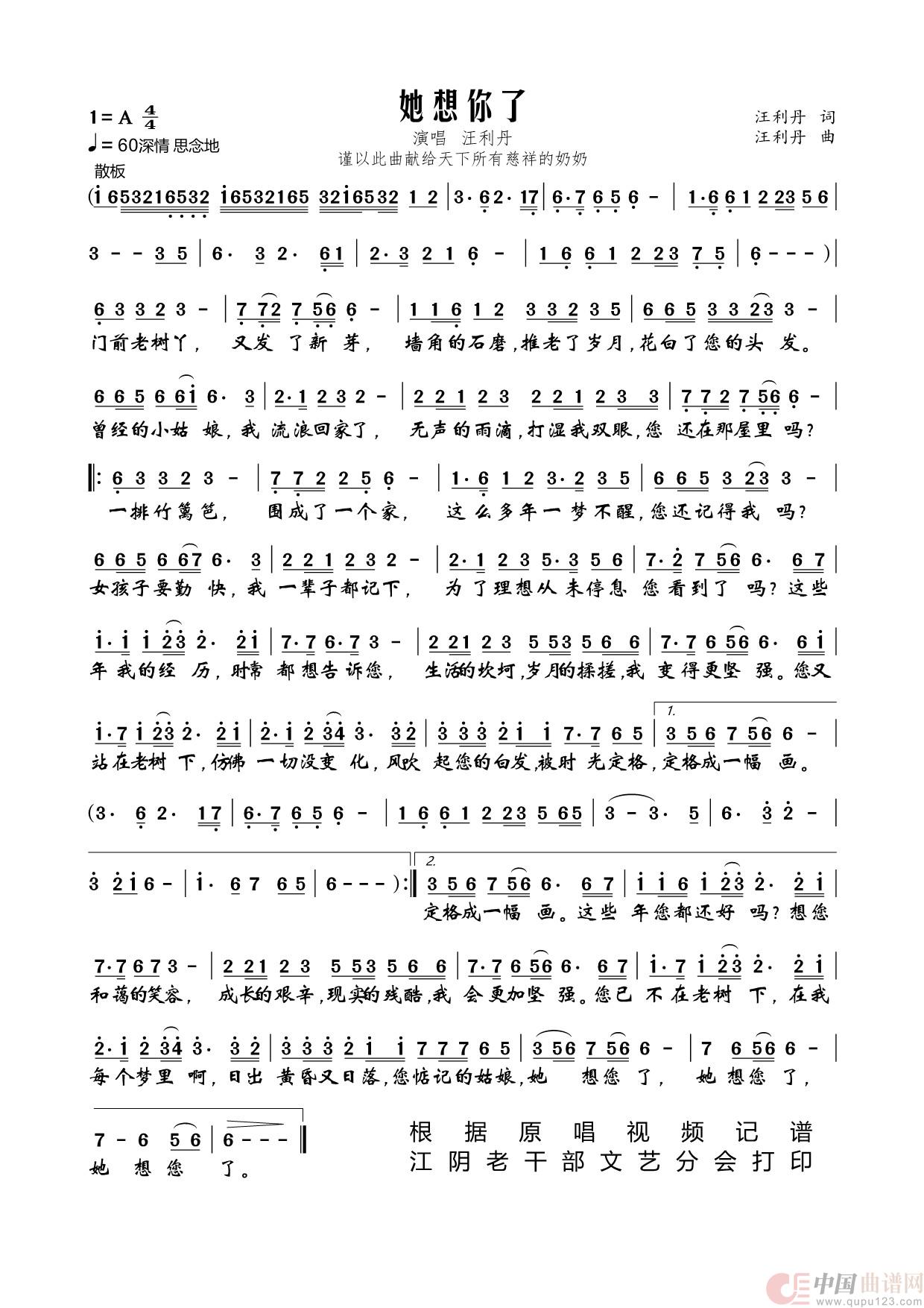 作词:汪利丹 作曲:汪利丹 演唱(奏):汪利丹 来源:根据原唱视频记谱并制谱 上传:终身学习