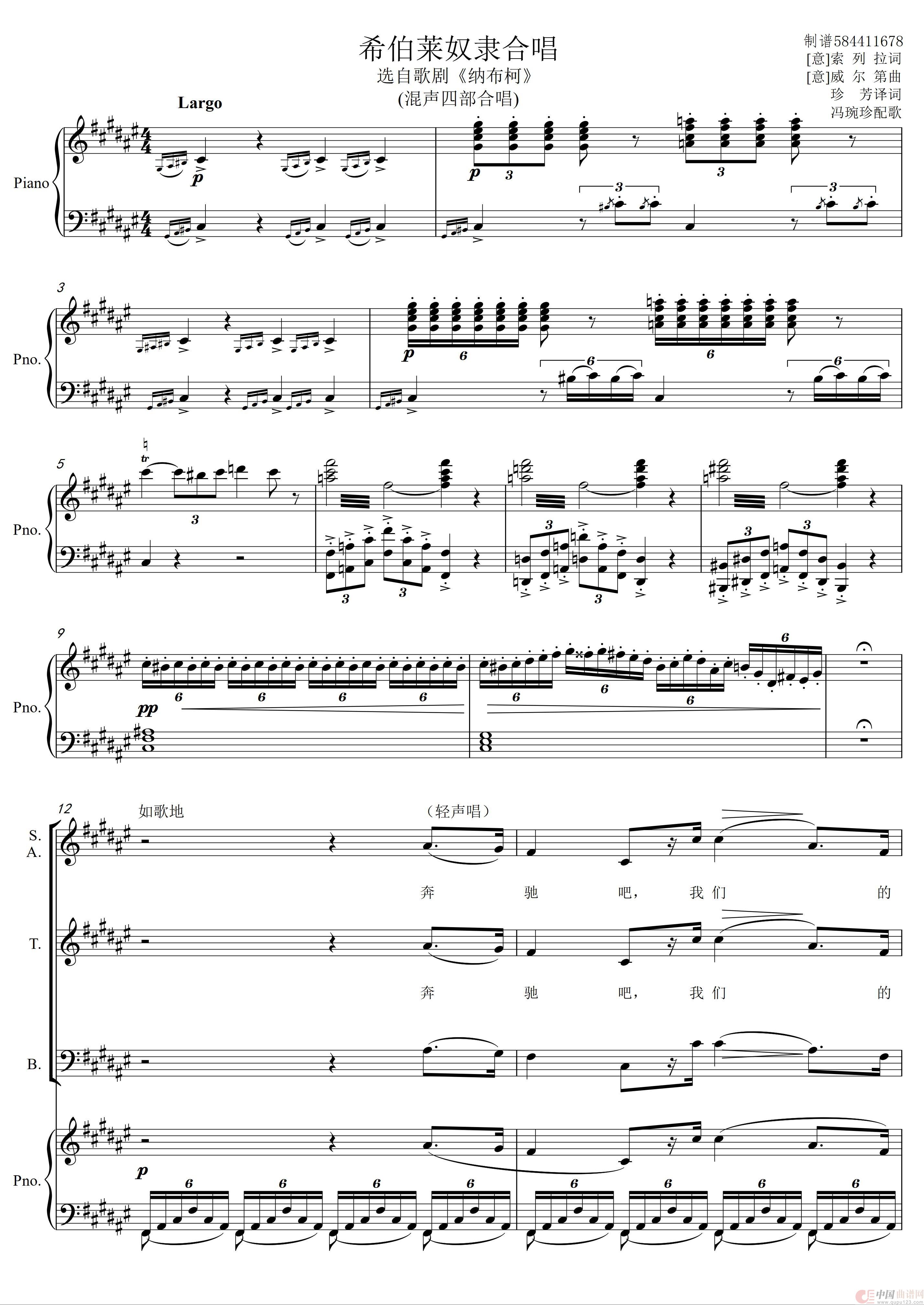 希伯莱奴隶合唱混声合唱谱