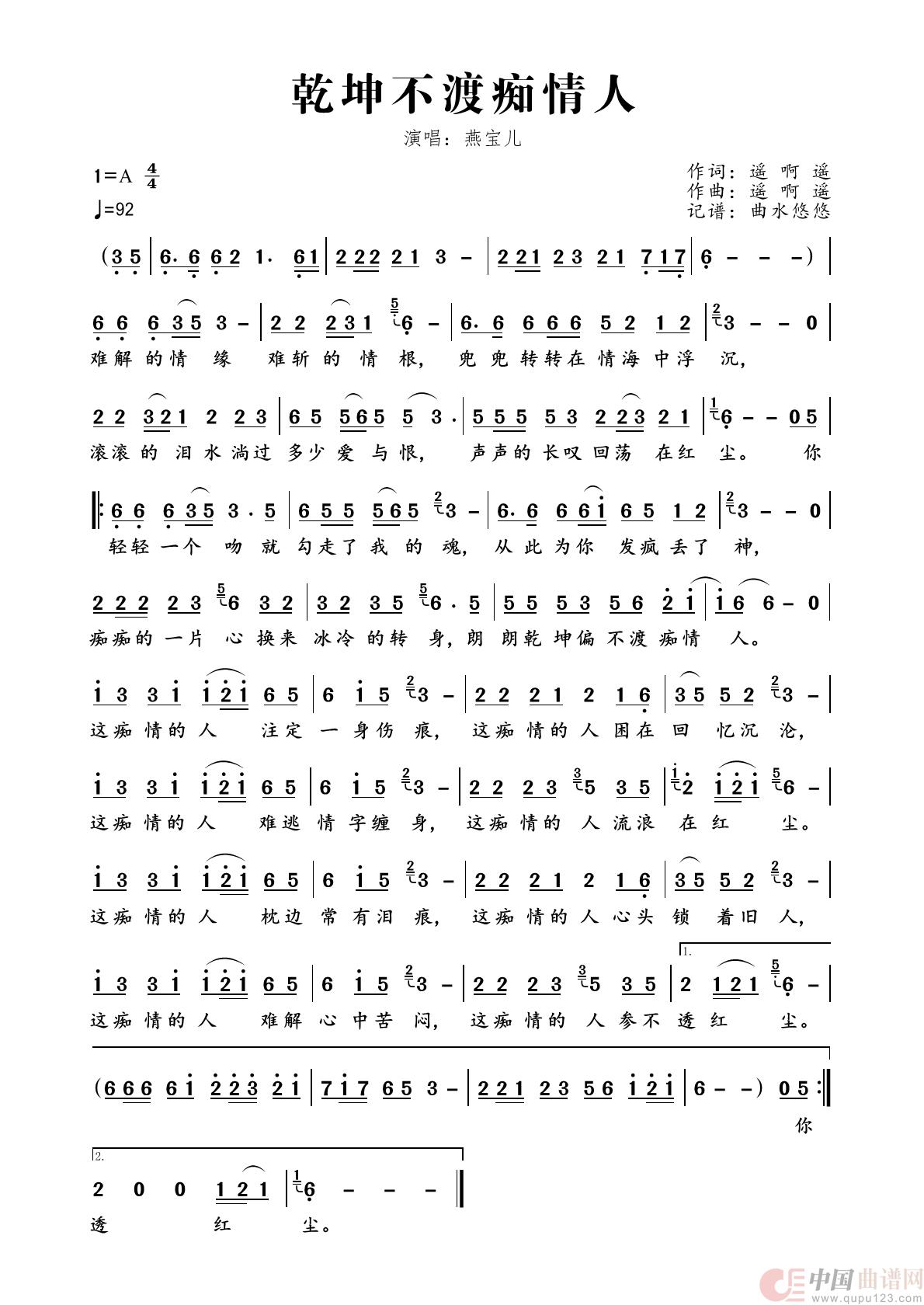 曲水老师为《乾坤不渡痴情人》记谱精准细腻,节奏与旋律还原度高,简谱清晰易读,贴合歌曲情绪起伏,专业度强,对学唱与演奏都很友好,是优质的记谱作品。
