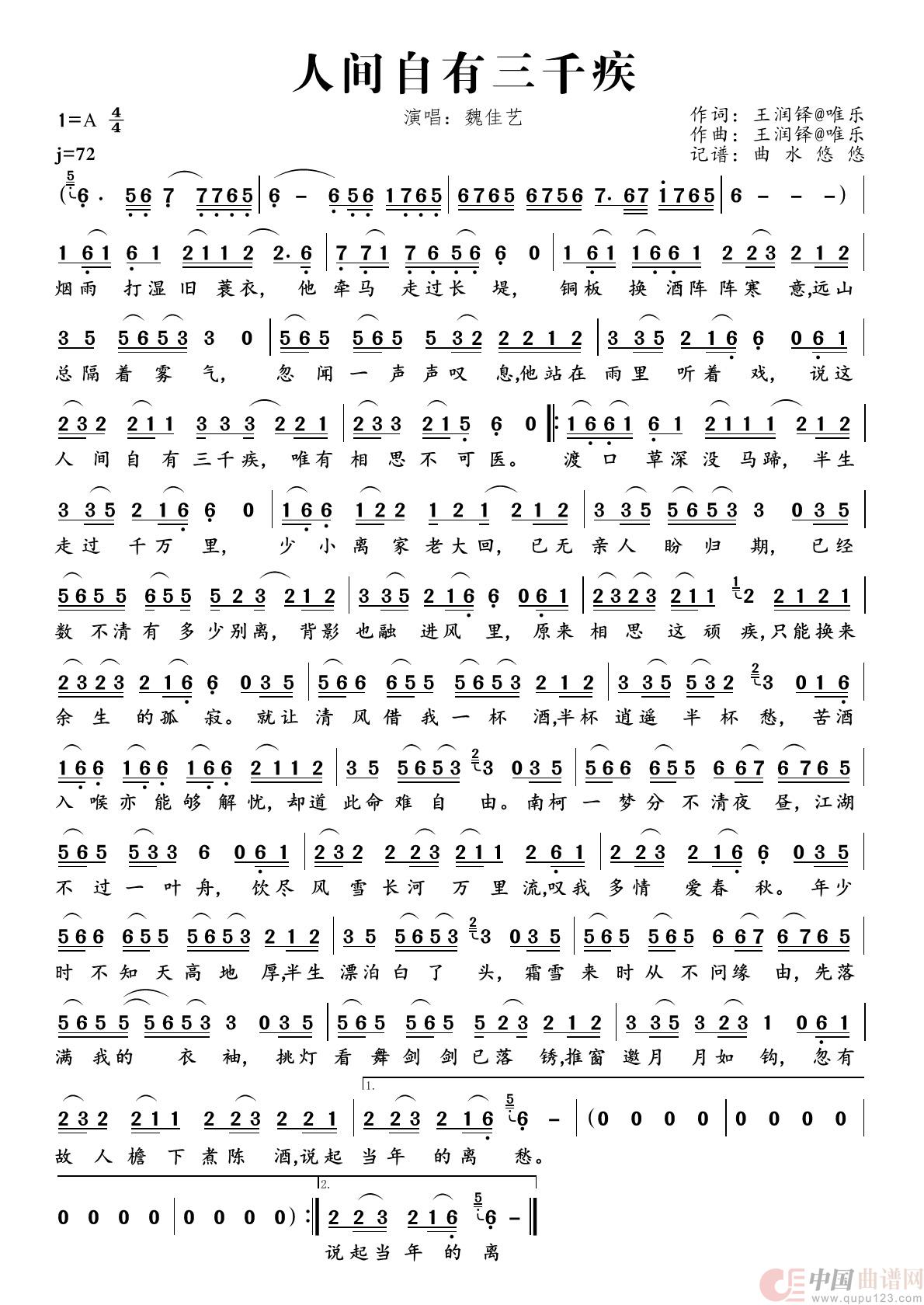 曲水老师做的《人间自有3000疾》谱子太绝了!魏佳艺唱得也好听,谱子工整清楚、调调准、看着舒服,照着唱一点不费劲,真是完美得没话说,太给力了!