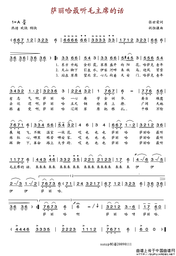 关于《萨丽哈最听毛主席的话》曲谱的评论