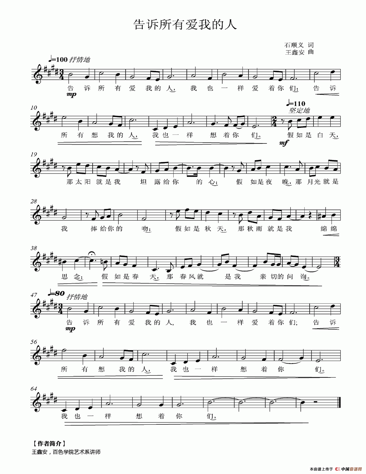 当前位置: 首页 民歌曲谱 八字歌名 告诉所有爱我的人(五线谱)