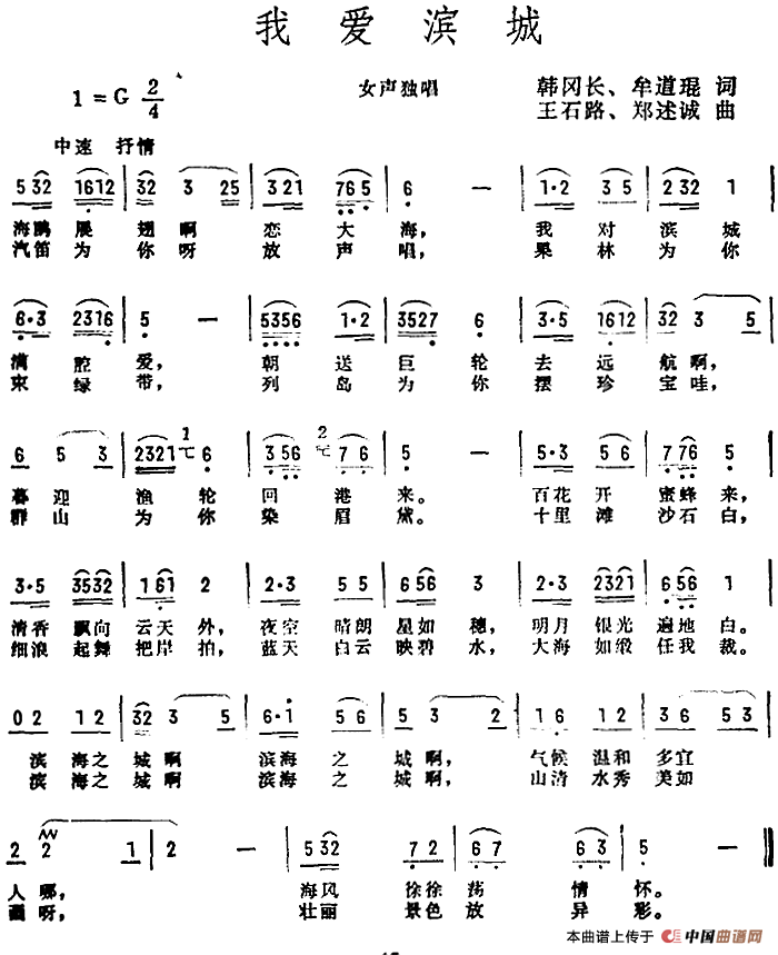 作词:韩冈长、牟道琨 作曲:王石路、郑述诚 来源:中国曲谱网 上传:热爱音乐88