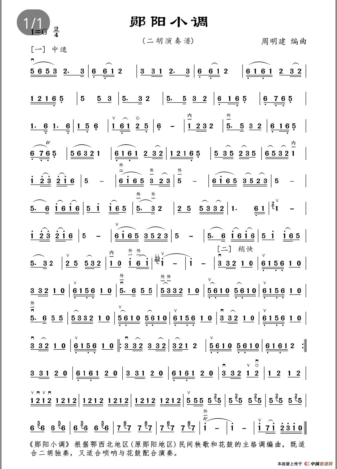 《郧阳小调》根据鄂西北地区(原湖北省郧阳地区)民间秧歌和花鼓风格编曲,既适合二胡独奏,又适合唢呐与花鼓配合演奏,欢快且风味独特。