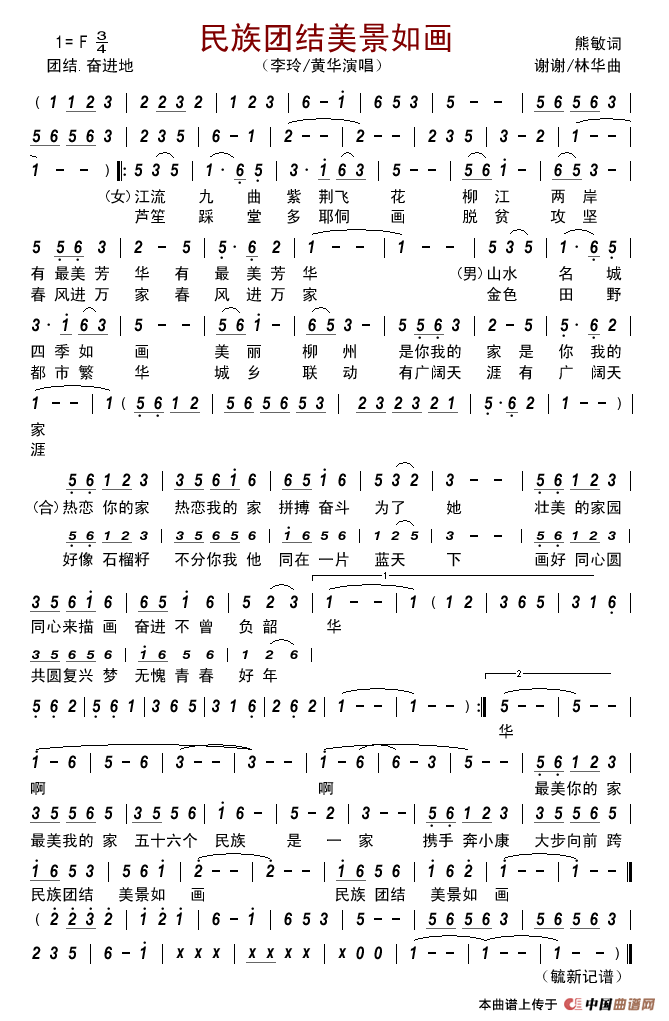 作词:熊敏 作曲:谢谢/林华 演唱(奏):李玲/黄华 来源:记谱 上传:毓新