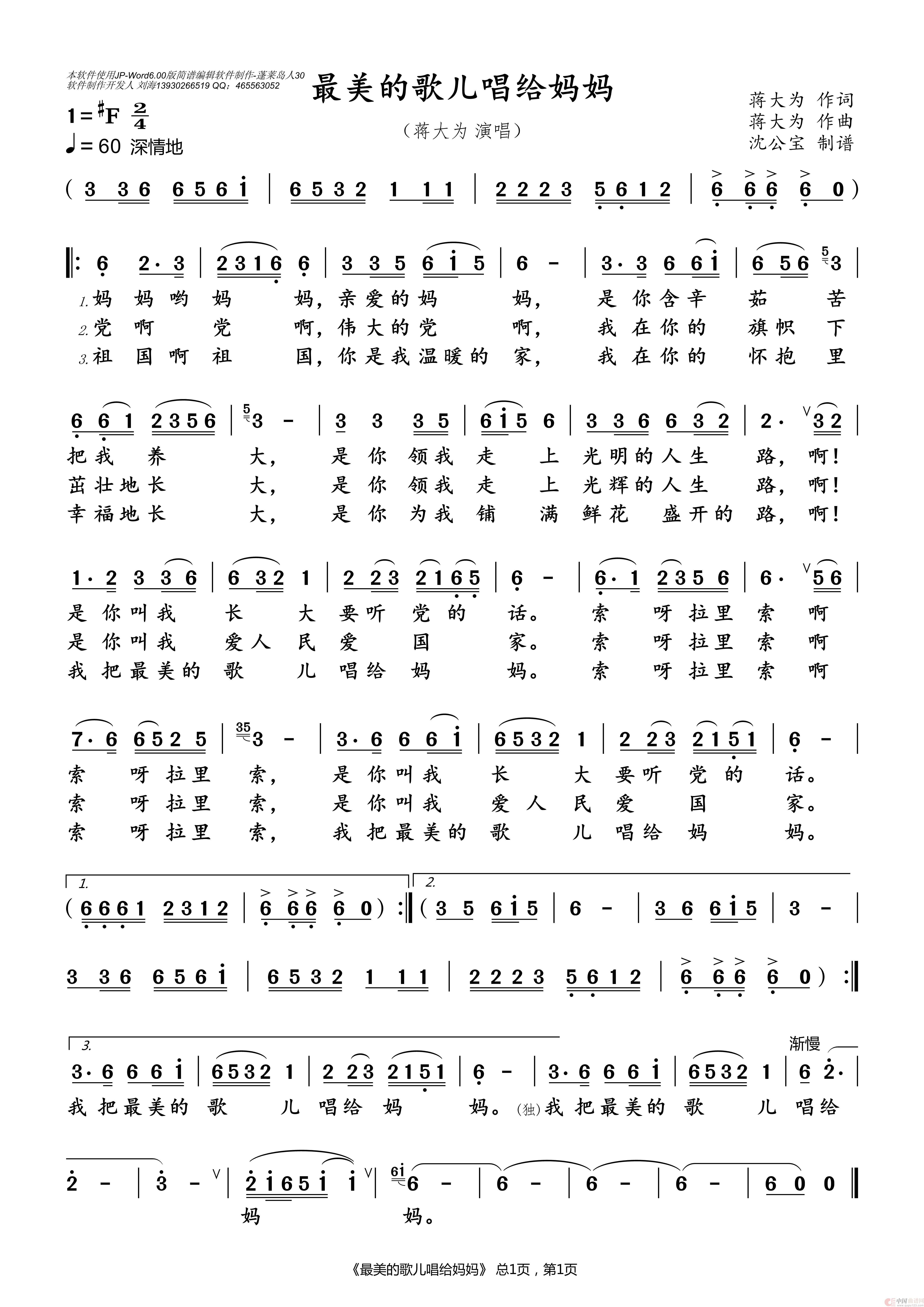 关于《最美的歌儿唱给妈妈》曲谱的评论