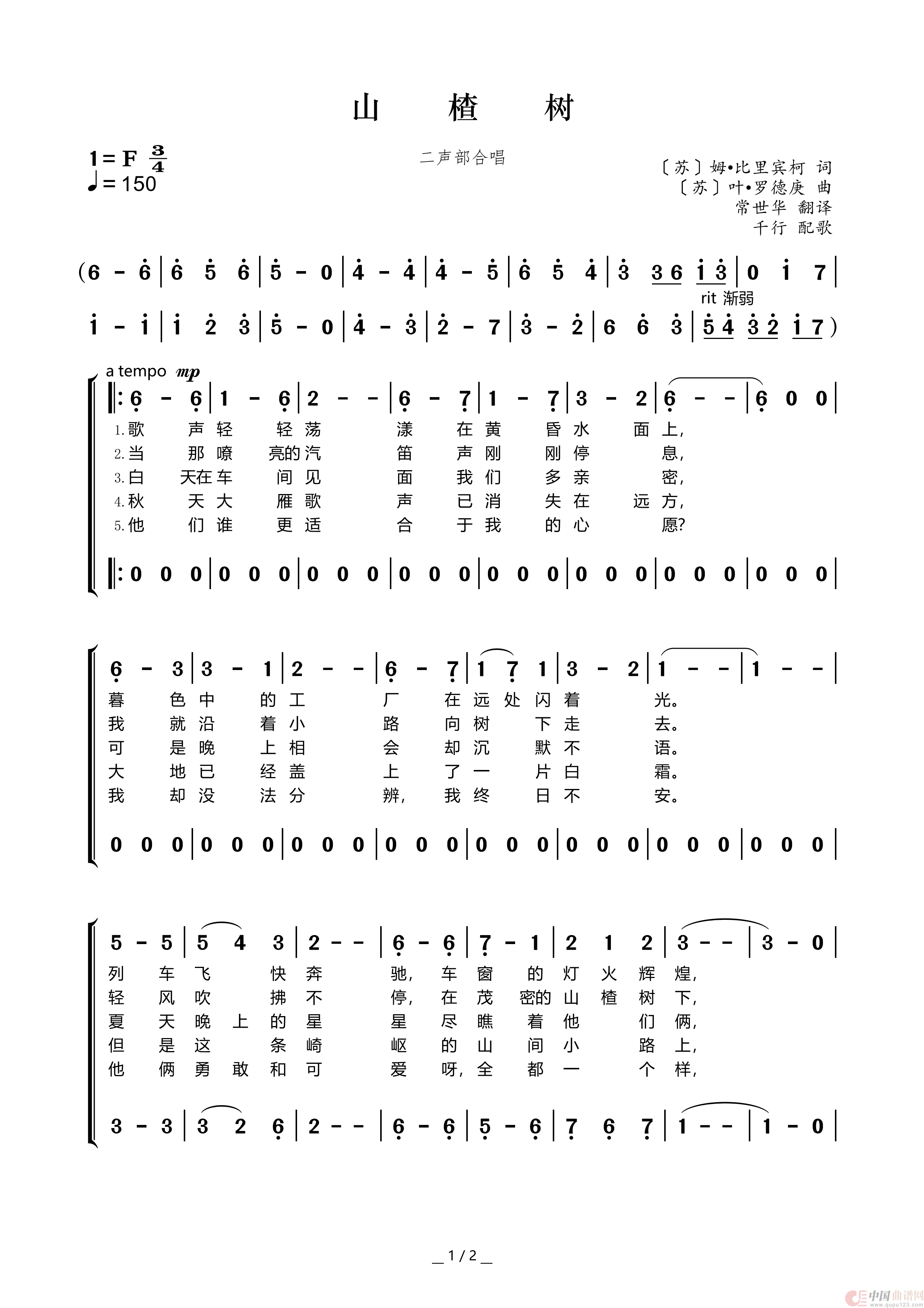 山楂树(二声部合唱简谱)(1)_原文件名:山楂树(简谱)_00.png