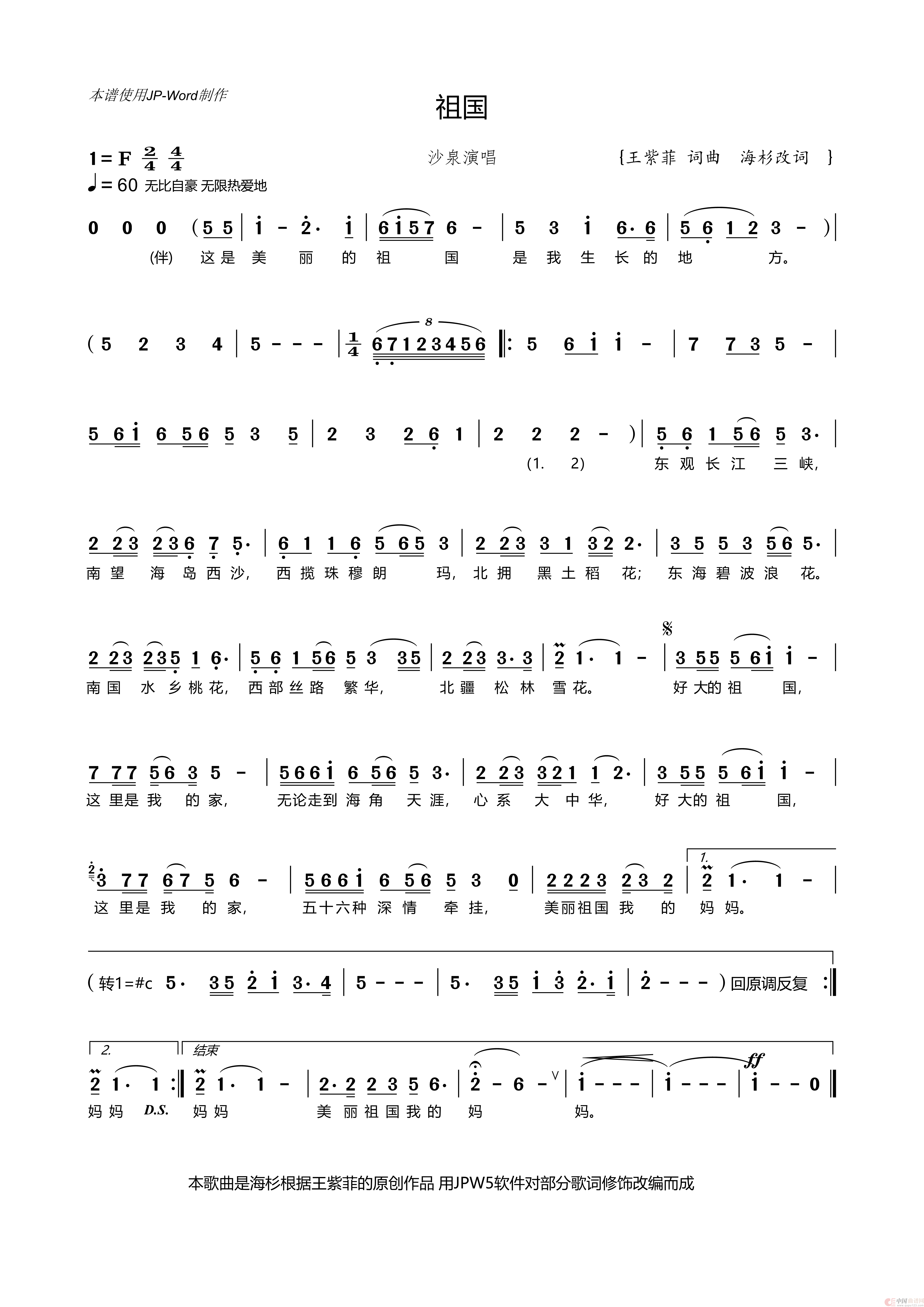 王紫菲的《祖国》确实写得很好!我平时是非常喜欢唱。但每次演唱总觉得歌词有个别地方还有修饰提高使之更工整,更押韵的空间,于是就有这次的大胆尝试,有不妥之处还请王紫菲见谅。 [回复]