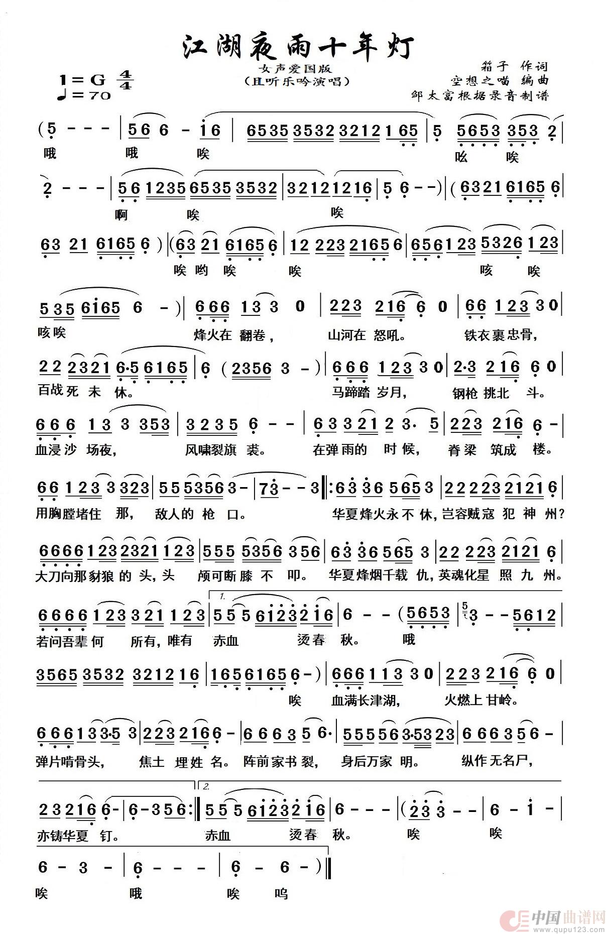 《江湖夜月十年灯》(爱国版)由箱子作词,空想之喵作曲,且听乐吟演唱,歌曲展现爱国先烈们为守疆土、顽强同侵华敌人进行生死搏斗的豪迈。本曲谱是作者根据相关演唱录音制作而成。
