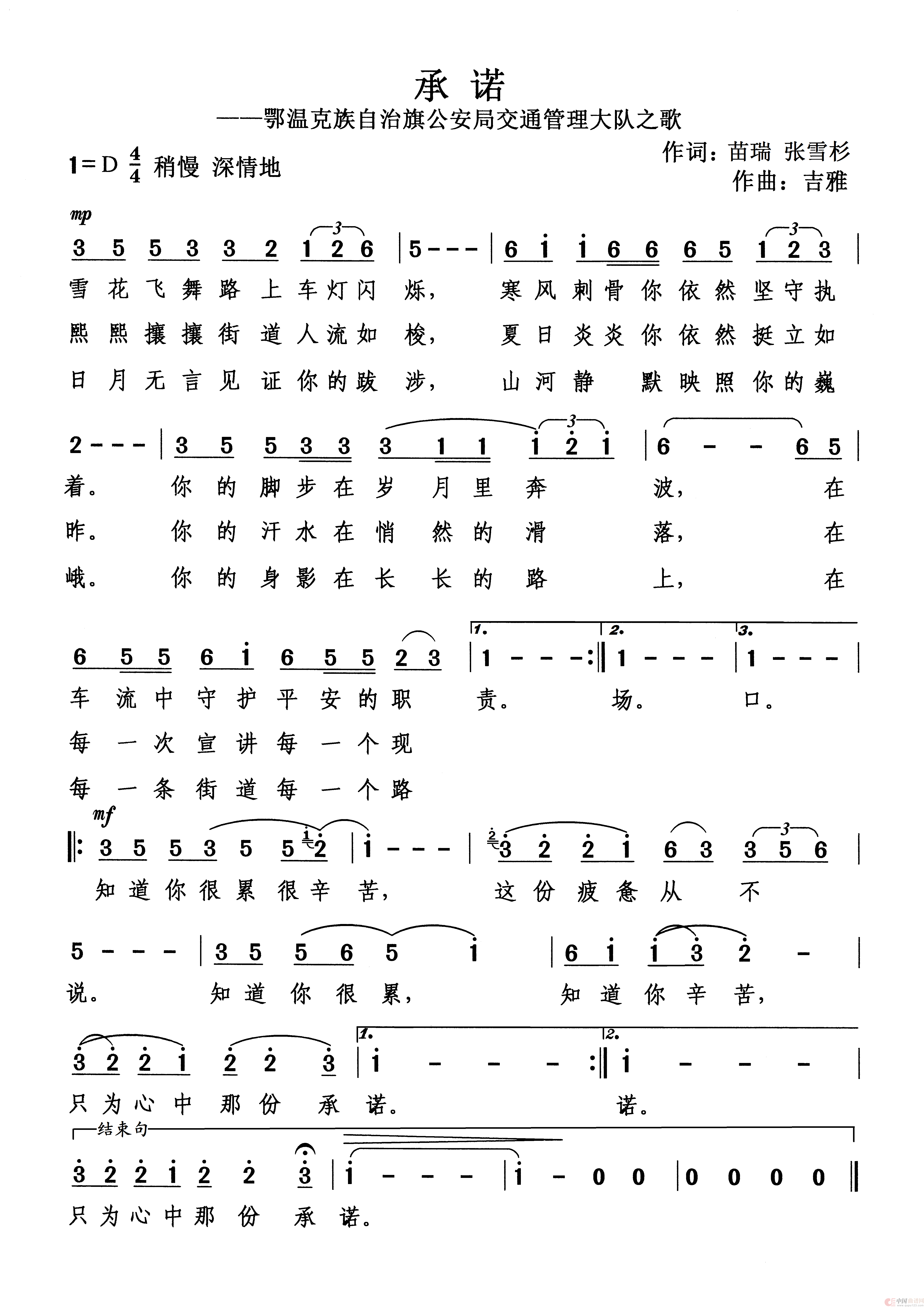 关于《《承诺——鄂温克族自治旗公安局交通管理大队之歌》》曲谱的评论