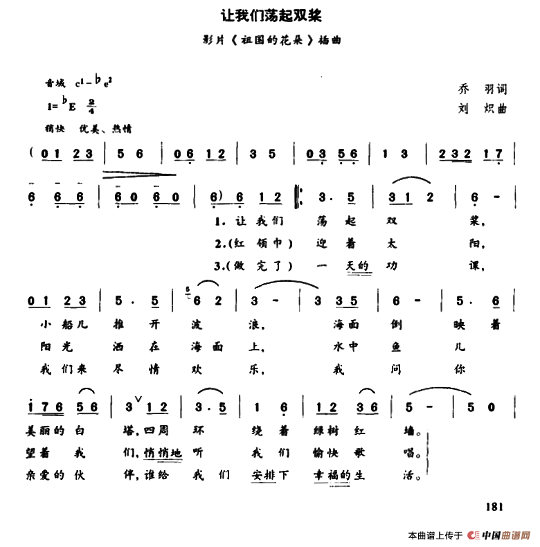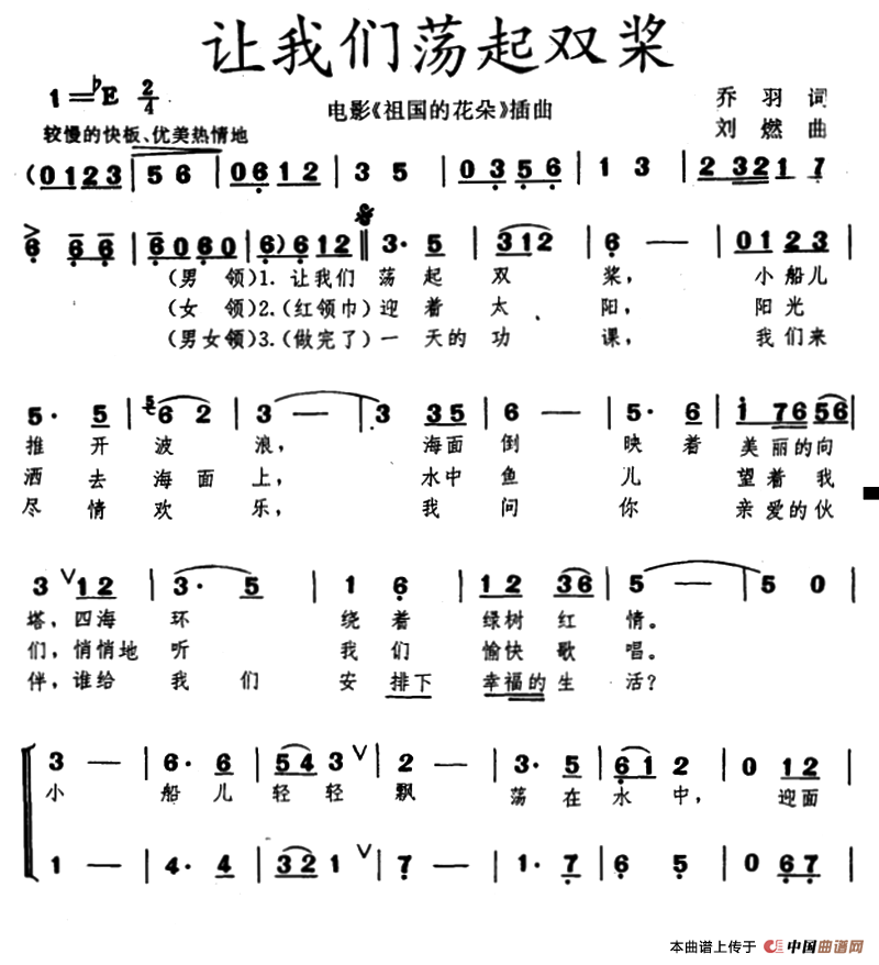 《让我们荡起双桨》是1955年拍摄的少儿电影《祖国的花朵》主题曲。这首由刘炽先生作曲,乔羽先生作词,旋律优美、节奏轻快的歌曲,创作于上世纪50年代,横跨半个世纪,影响了足足三代少先队员。并于2002年在北师大版小学三年级课本上被选为课文。《让我们荡起双桨》作为新中国第一部儿童电影的主题曲,为新中国最受儿童喜爱的歌曲之一。这首歌在五十年代可谓是红遍华夏大地,可以说无人不知,无人不晓,并深受喜爱。它实际上是电影故事片《祖国的花朵》中的主题曲。这部电影是长春电影制片厂1955年摄制完成的,是新中国的第一部儿童影片。就创作而言,这首歌是为《祖国的花朵》专门定制的,它必须依附于这部电影故事的本身,才更有价值和意义。