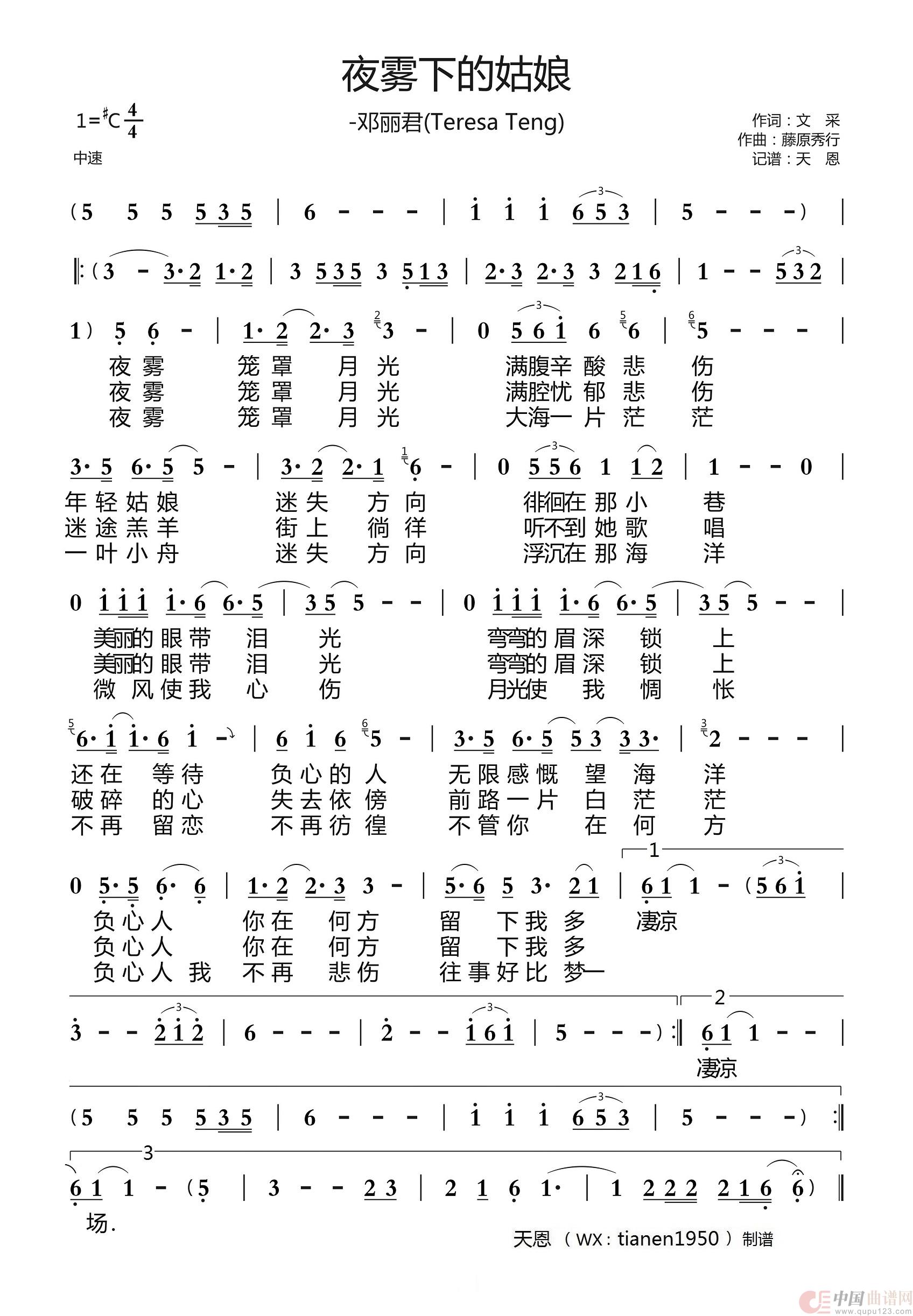 关于《夜雾下的姑娘 -邓丽君》曲谱的评论