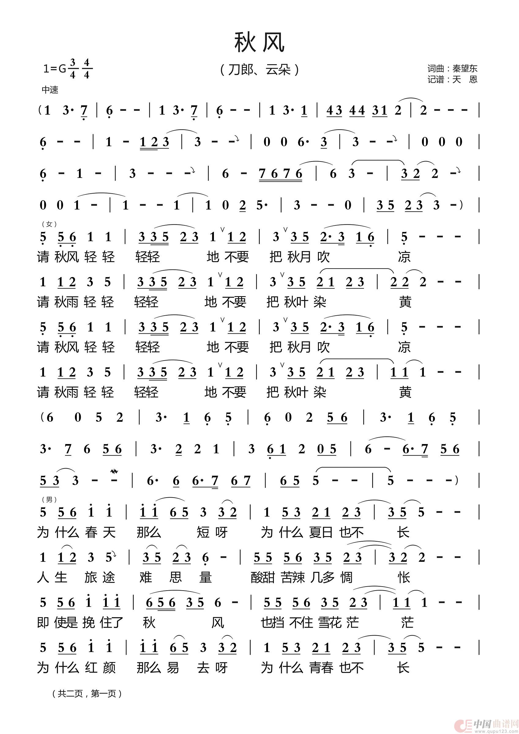关于《秋风-刀郎、云朵》曲谱的评论