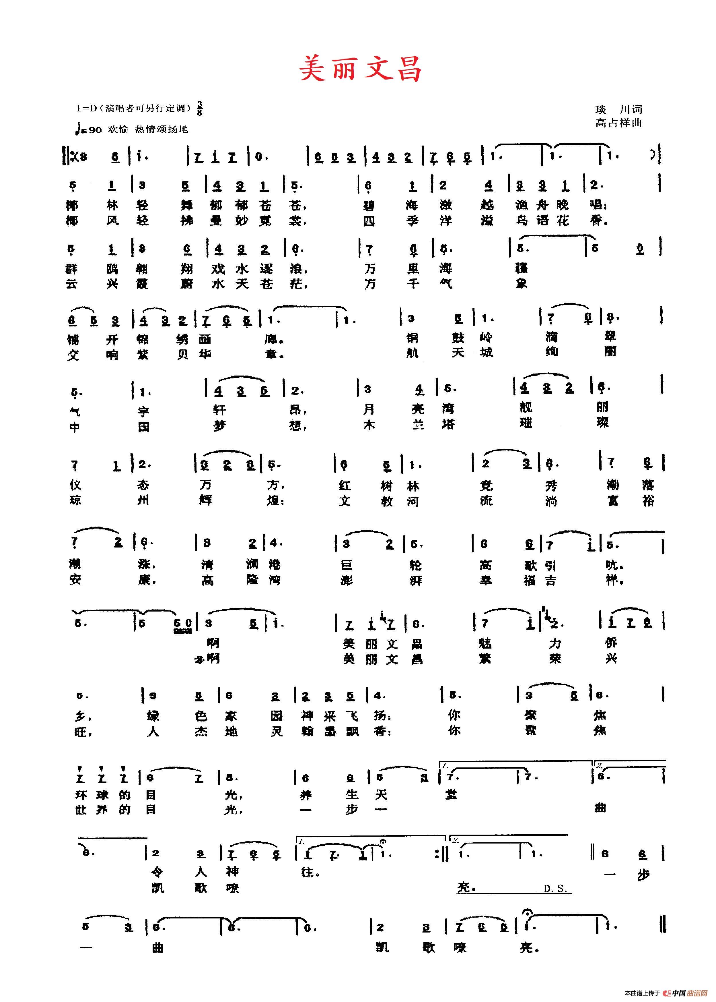 读了好友转来邀我谱曲的琰川先生的《美丽文昌》歌词,犹如一幅幅绚丽的画卷在我脑海里浮现,着实给我以身临其境之感;沉浸于歌词的意境后考虑文昌是侨乡,便拟写出了此旋律。借此机会,我谨向这首能激发出此旋律的歌词创作者、为此歌助力的编曲和诸位倾情演唱者,向所有一贯关注和支持“高占祥业余爱乐角”的众师友一并表示最诚挚的谢意!天津 高占祥