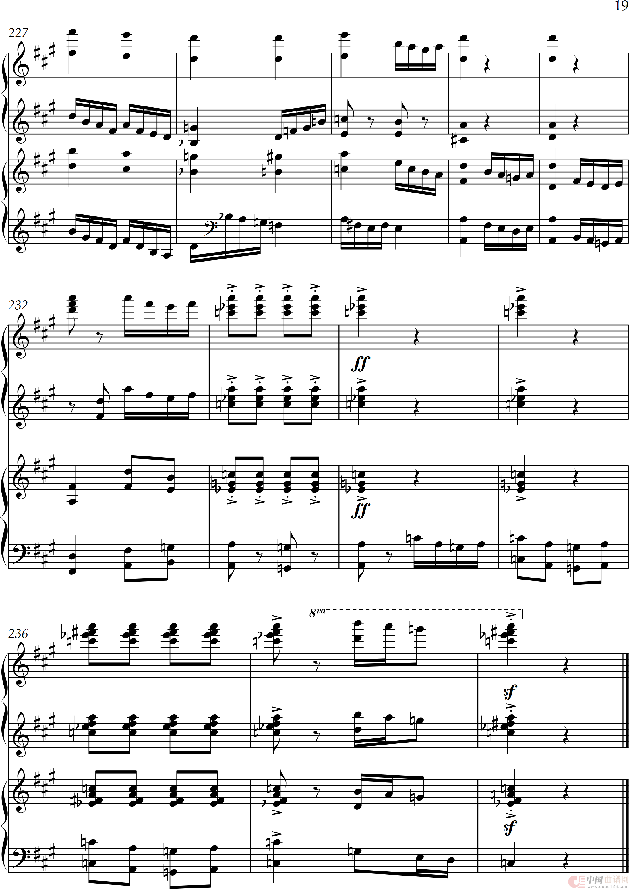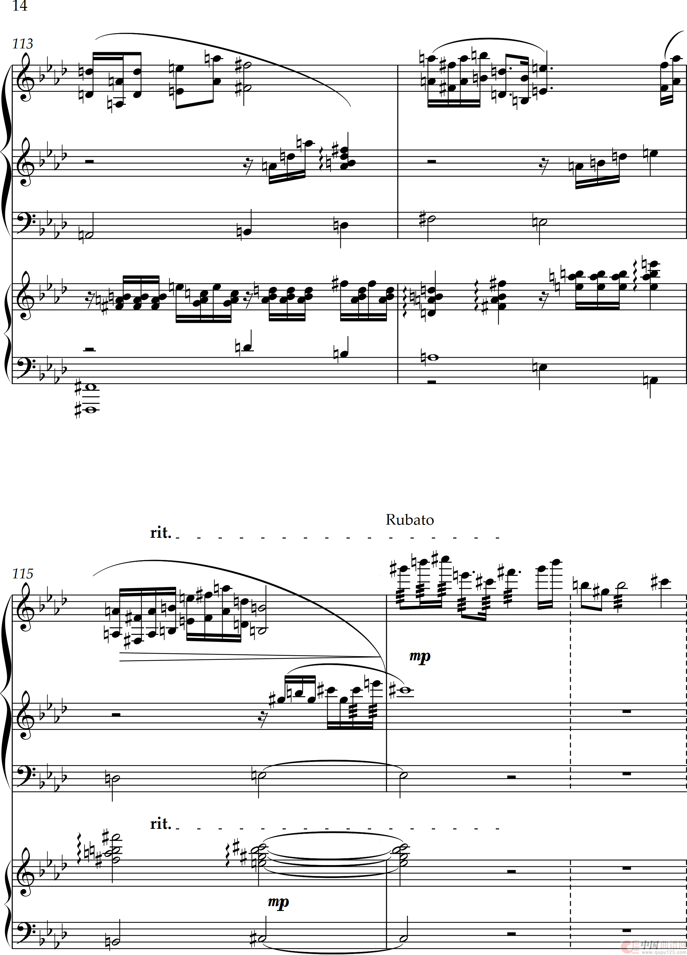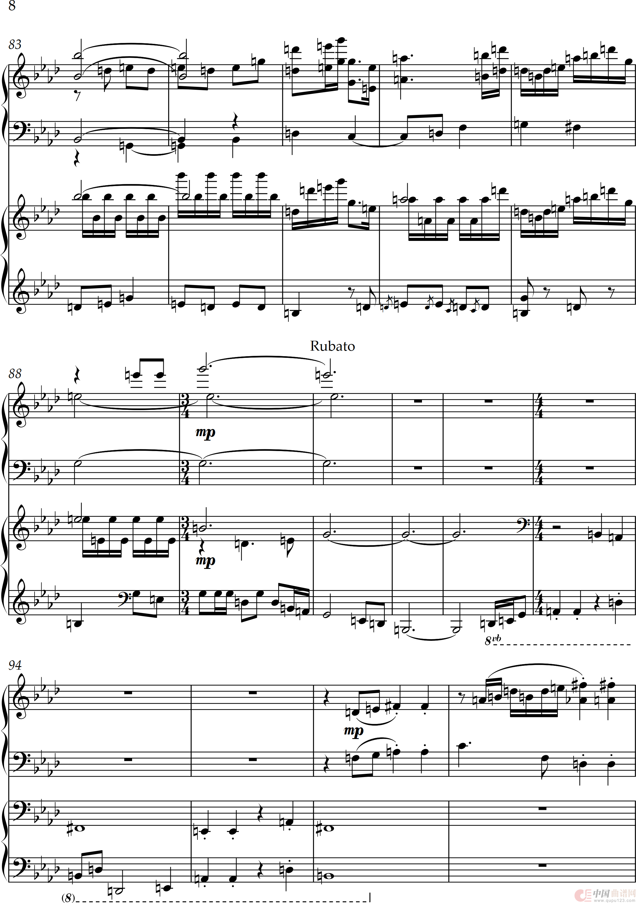 第三乐章《七字仔·哭调》——变体回旋曲式。运用了福建芗剧音乐【七字仔·哭调】与秦腔、评剧等音乐为素材,表现中华民族优秀传统文化相融合的特性。