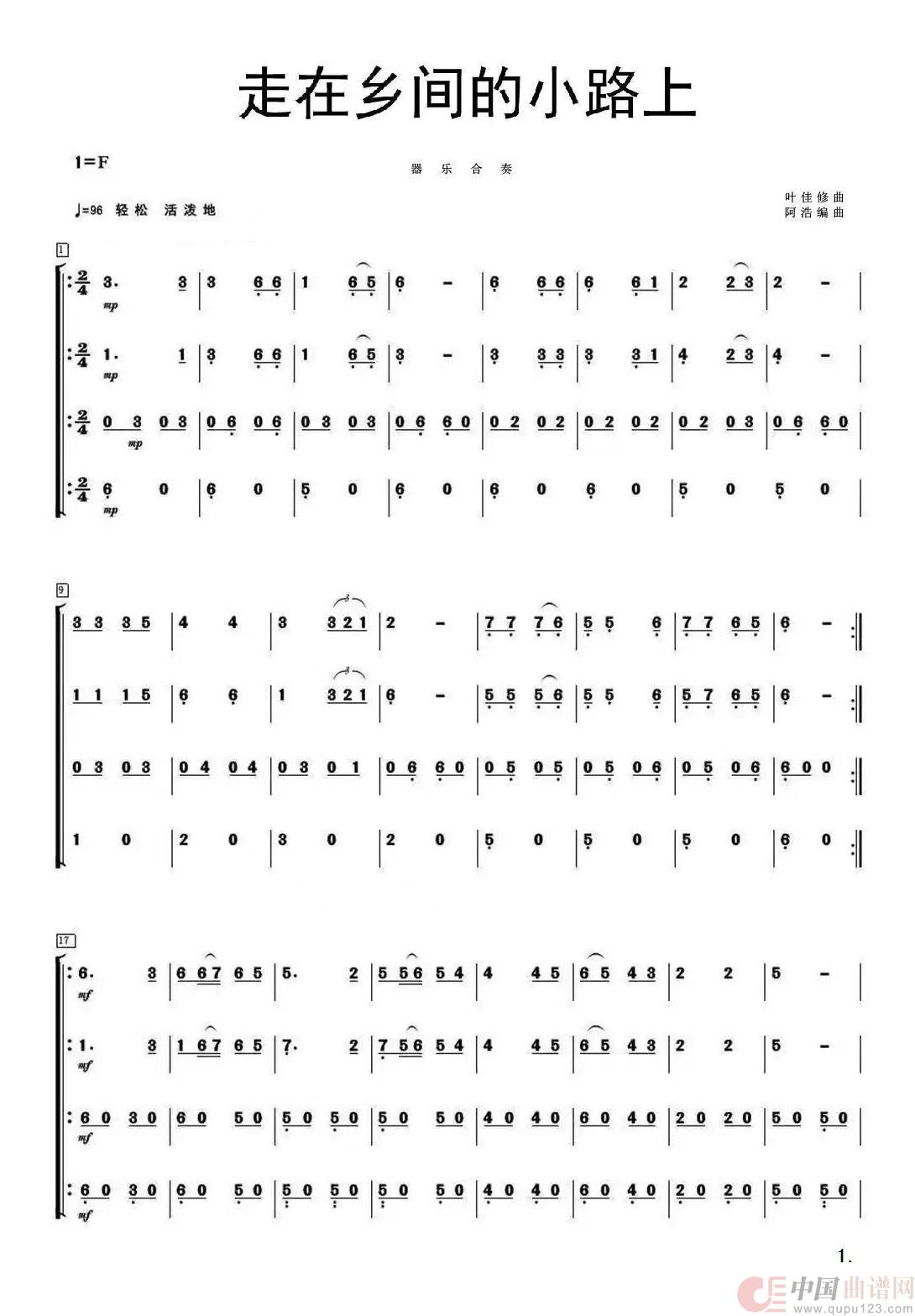 走在乡间的小路上(四声部合奏简谱)