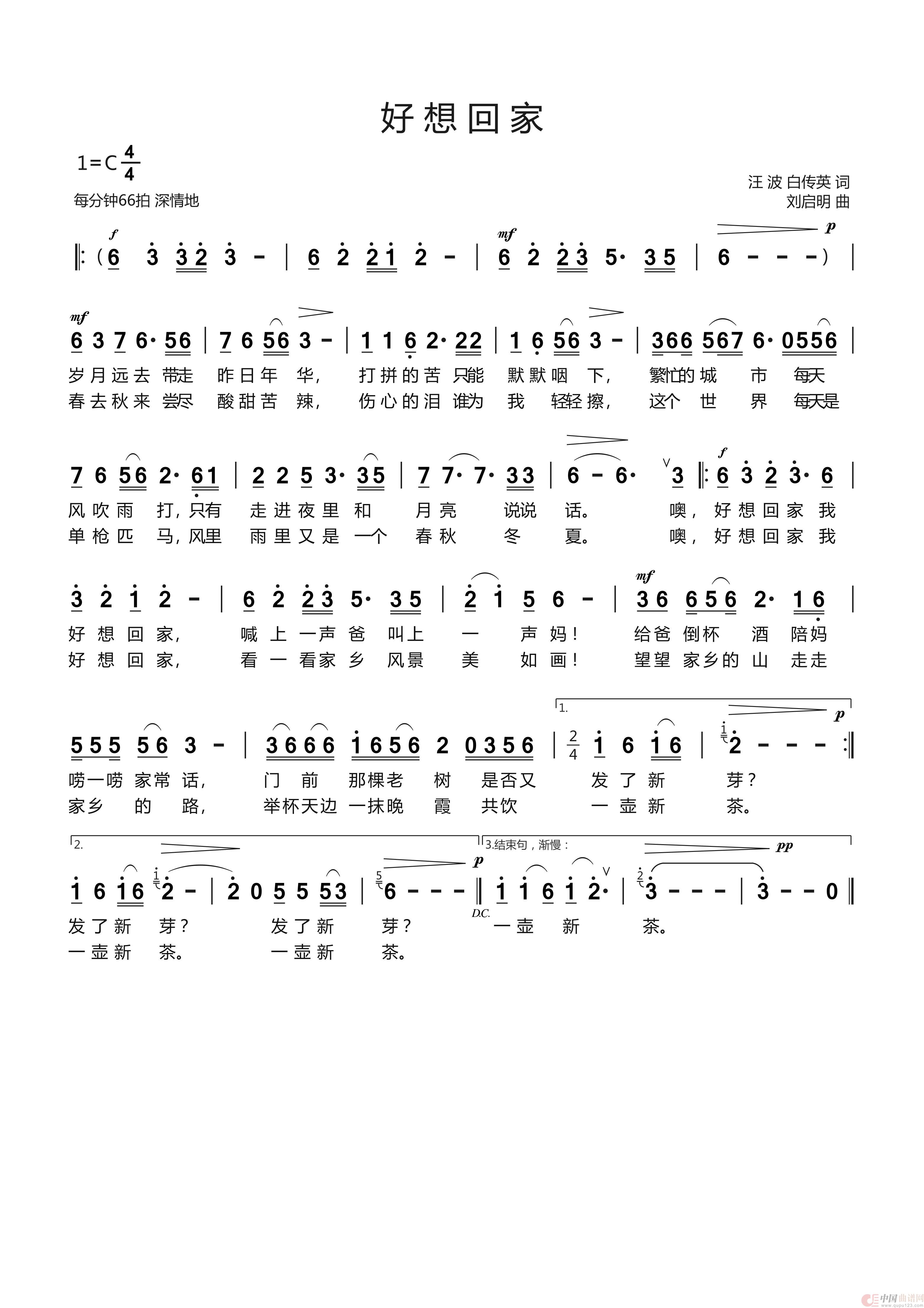 关于《《好想回家》汪波 白传英词 刘启明曲 熊七梅唱》曲谱的评论
