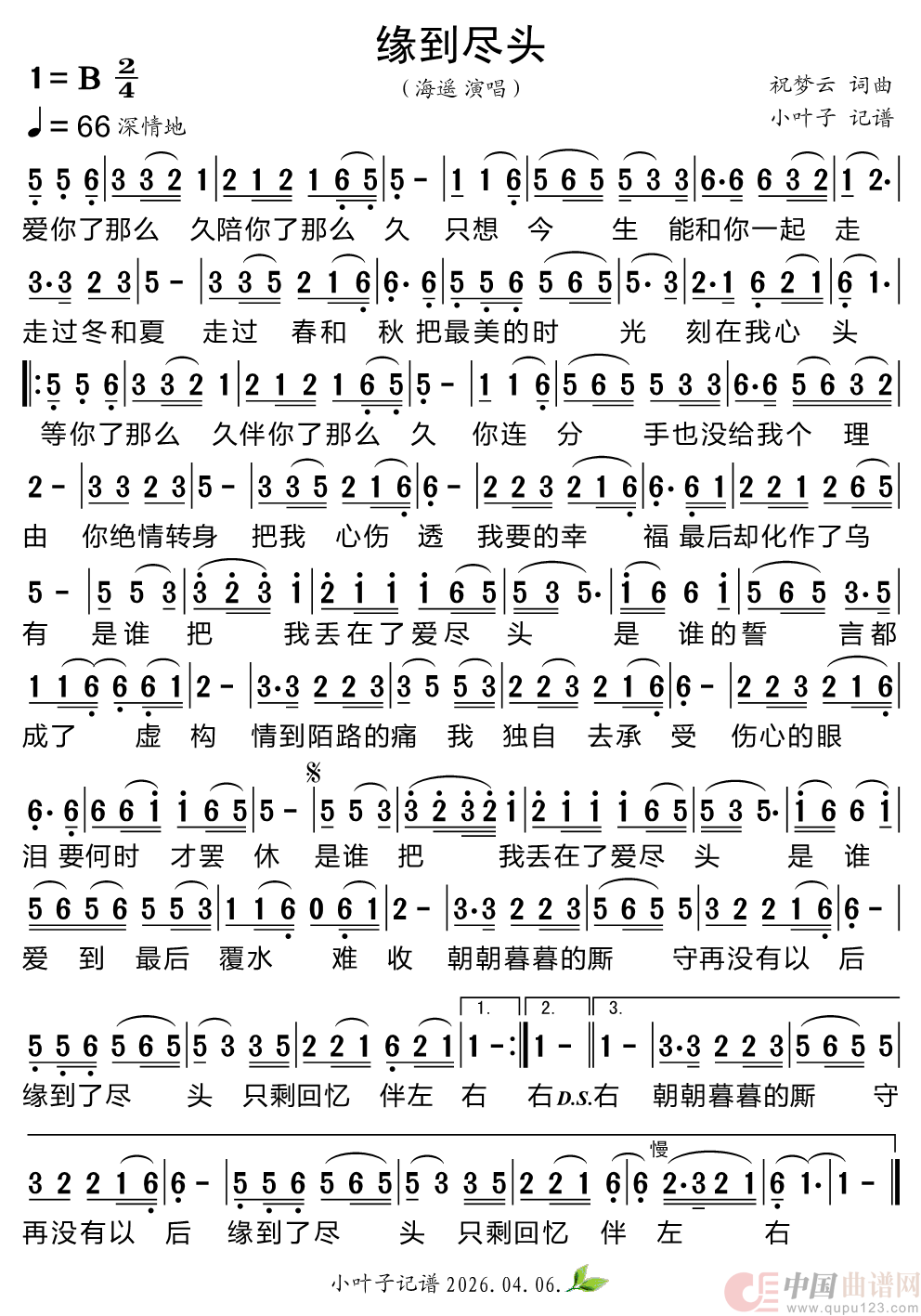 关于《缘到尽头》曲谱的评论